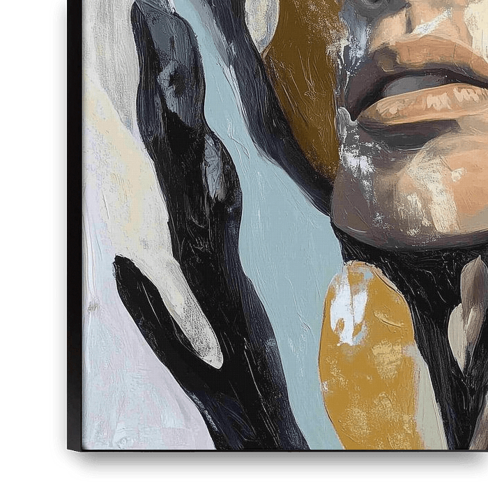 Portrait intrigant d'une femme, dont le visage est partiellement recouvert de coups de pinceau abstraits dans des tons contrastés de noir, d'or et de blanc. La femme dégage un mélange de force et de vulnérabilité, tandis que ses yeux expressifs interpellent immédiatement le spectateur. Les accents dorés apportent chaleur et luxe à la…