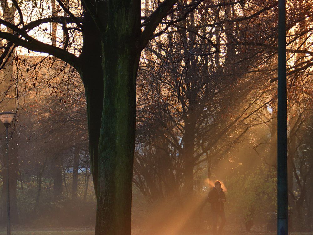 Lever de soleil et brouillard matinal dans la Berger Aue à Gelsenkirchen avec déambulateur