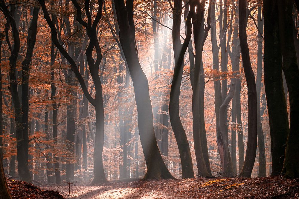 Les arbres dansants du Speulder et du Sprielderbos. L'une des plus anciennes zones forestières des Pays-Bas, située dans le parc national de Veluwe, ne contient que des arbres tordus. Le matin, lorsque la brume flotte entre les arbres, une atmosphère mystique se dégage. Cette photo est faite en automne automne en automne avec ses couleurs intenses. Le soleil levant du matin brille parmi les arbres avec ses rayons de soleil et illumine le sentier.