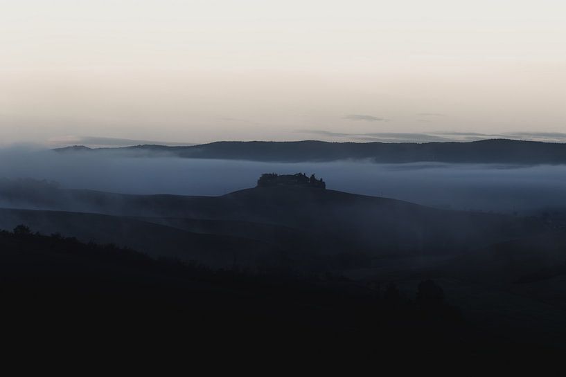 Matin de printemps brumeux au-dessus d'une ferme sur une colline en Toscane