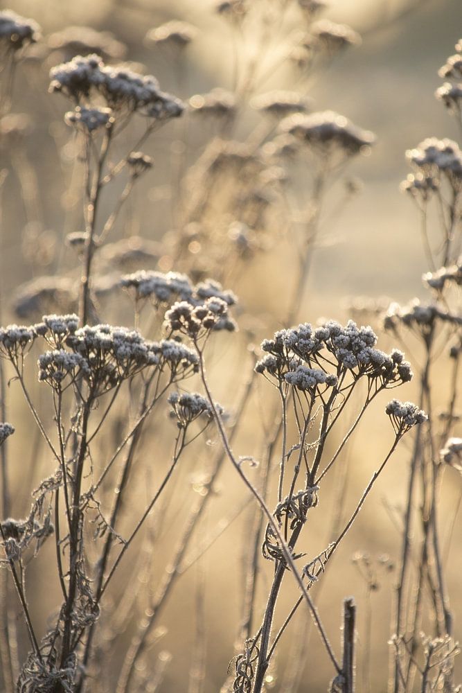 Une douce lumière dorée au lever du soleil par un froid matin d'hiver dans la campagne flamande. Les capitules séchés de la fleur sauvage, Achillea millefolium, sont magnifiquement éclairés par le soleil levant. Des teintes chaudes et douces de taupe et d'or.