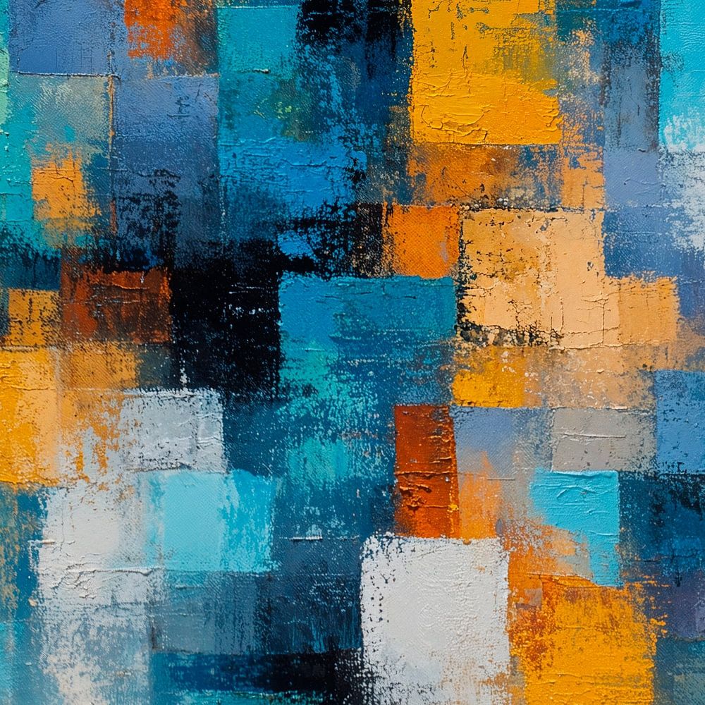 Une peinture abstraite avec une composition vibrante de carrés et de rectangles qui sont superposés et texturés, donnant une impression de profondeur et de mouvement. Les coups de pinceau puissants créent un jeu dynamique entre l'ombre et la lumière. Le style général est moderne et énergique, évoquant un sentiment d'harmonie et…