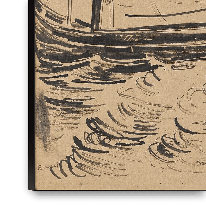 Cette œuvre de 1911 a été créée lors des premières visites de Pechstein en mer Baltique (par exemple à Nidden ou à la Courlande), où il a intensément capturé la vie authentique des pêcheurs et leurs bateaux. Les Kurenkähne symbolisent la vie simple et difficile en mer et l'harmonie entre l'homme et les éléments – un motif typique du groupe Brücke, caractérisé par une vitalité primitive et une fuite de la modernité urbaine. Le dessin montre la fascination de Pechstein pour l'observation directe et le quotidien, avec une énergie brute et spontanée qui reflète les idéaux du Brücke de liberté et de force naturelle.