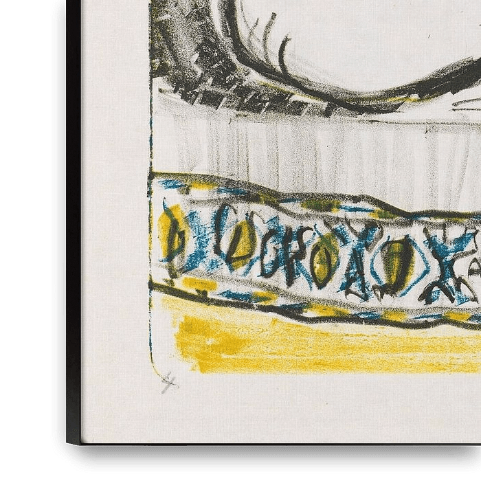 Une lithographie stylisée (ou lithographie en couleurs) représentant deux femmes légèrement vêtues dans un décor intime de harem. Les femmes sont assises ou allongées de manière détendue sur un lit ou un divan, avec de longs cheveux foncés (l'une a les cheveux bouclés), dans des poses sensuelles et avec des visages expressifs (l'une a le genou relevé, l'autre est penchée). L'arrière-plan est abstrait, avec des rideaux ou des murs jaunes et bleus, des motifs décoratifs et un vase ou une colonne. Les couleurs sont limitées mais intenses (bleu, ocre/jaune, olive/vert olive, noir), avec des contours épais et une touche exotique et primitive ; signé « HMP 09 » ou variante. Signification Cette œuvre de 1909 (début de la période Brücke) montre la fascination de Pechstein pour l'exotisme et « l'autre » - le harem comme symbole de sensualité, de liberté et de fantaisie orientale. Inspirée par l'art non occidental et l'orientalisme, elle célèbre le corps nu dans un décor décoratif et érotique. Elle s'inscrit dans les idéaux du Brücke, à savoir l'émotion brute, la libération des conventions bourgeoises et le primitivisme. En 1909, elle marque les expérimentations de Pechstein avec la couleur et la forme, avec une charge onirique et sensuelle typique de ses premiers thèmes de la féminité et de l'évasion. Technique Lithographie en couleurs (farblithographie) en bleu, ocre, vert olive et noir sur papier : plusieurs pierres pour une impression couche par couche, avec des lignes expressives et des aplats de couleur pour un effet décoratif, presque semblable à une affiche. La technique met l'accent sur le contraste et la simplicité, caractéristiques de l'œuvre graphique de Pechstein en 1909, inspirée des gravures sur bois du groupe Brücke, mais avec une lithographie colorée pour plus d'accessibilité et d'expression.