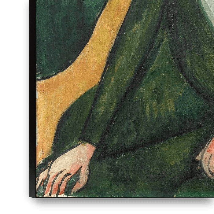 Max Pechstein’s Damenbildnis uit 1913 is een krachtig en expressief portret van een vrouw, geschilderd in een stijl die typerend is voor het Duitse expressionisme. De vrouw zit in een groene kamer, op een gele stoel, gekleed in een donkergroene jurk met een lichte halslijn. Haar korte donkere haar heeft warme roodachtige accenten, en…