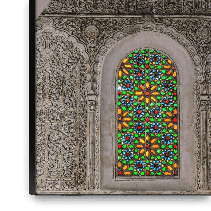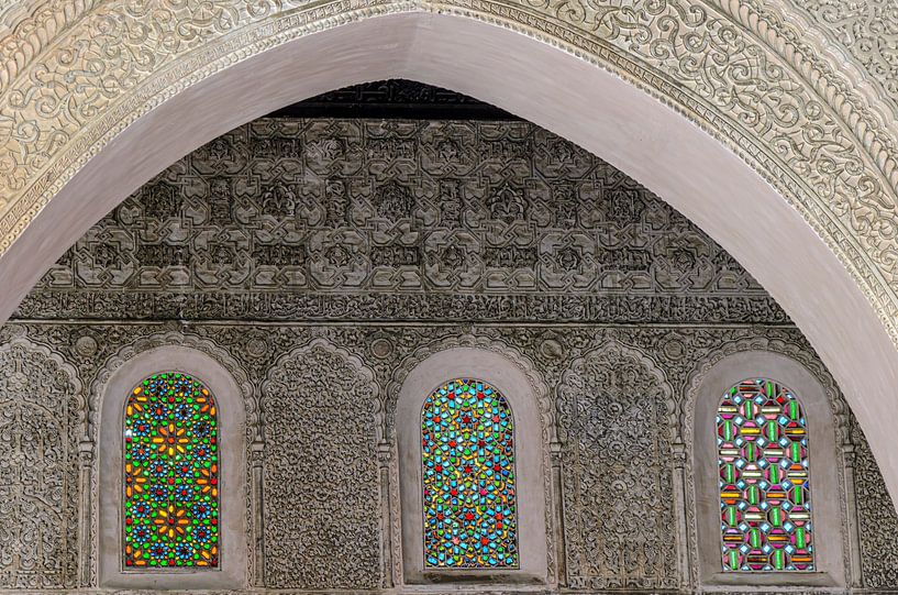 Photo relief et ornements dans la medersa de Fès Maroc avec fenêtres colorées