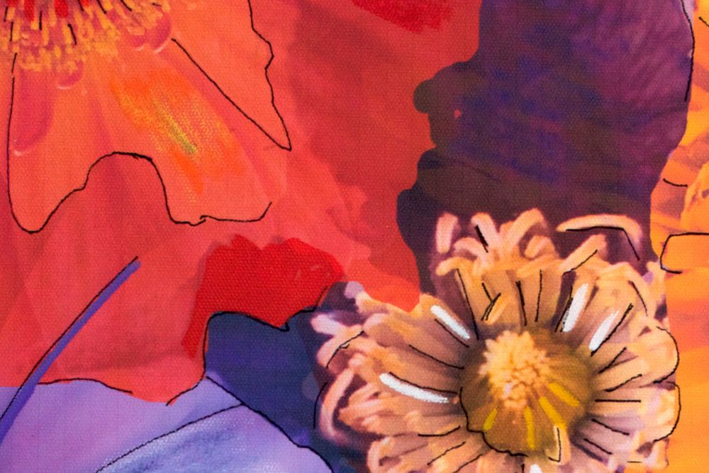 Médias mixtes avec des photos de différentes fleurs dans les couleurs rouge, orange et violet, peintes et dessinées plus tard.