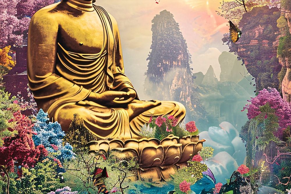 Ce design enchanteur vous emmène dans une oasis de tranquillité et de beauté naturelle. Un bouddha doré est assis dans une contemplation sereine, entouré d'un jardin luxuriant de fleurs colorées et d'arbres majestueux. Les fleurs roses, rouges et bleues se détachent sur les feuilles vertes, créant une atmosphère d'harmonie et de paix. Cette œuvre d'art incarne l'essence de la spiritualité et la beauté de la nature, idéale pour apporter un sentiment de calme dans votre espace de vie. Elle invite à la réflexion et à la méditation, une échappatoire parfaite à l'agitation de la vie quotidienne.