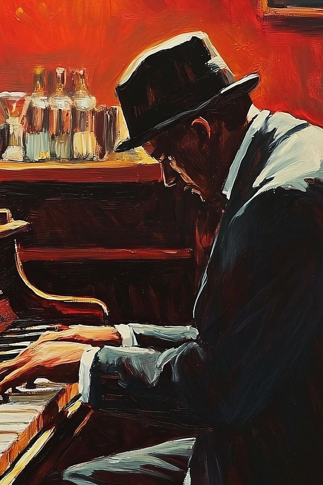 Le tableau montre un homme mélancolique, vêtu d'un costume élégant et d'un chapeau classique, assis à un piano dans un café jazz. La scène est peinte dans des tons rouges atténués, qui créent une atmosphère de solitude et de réflexion. La pièce est peu éclairée, avec une lumière chaude qui se reflète doucement sur les surfaces en bois poli du piano et des tables.
