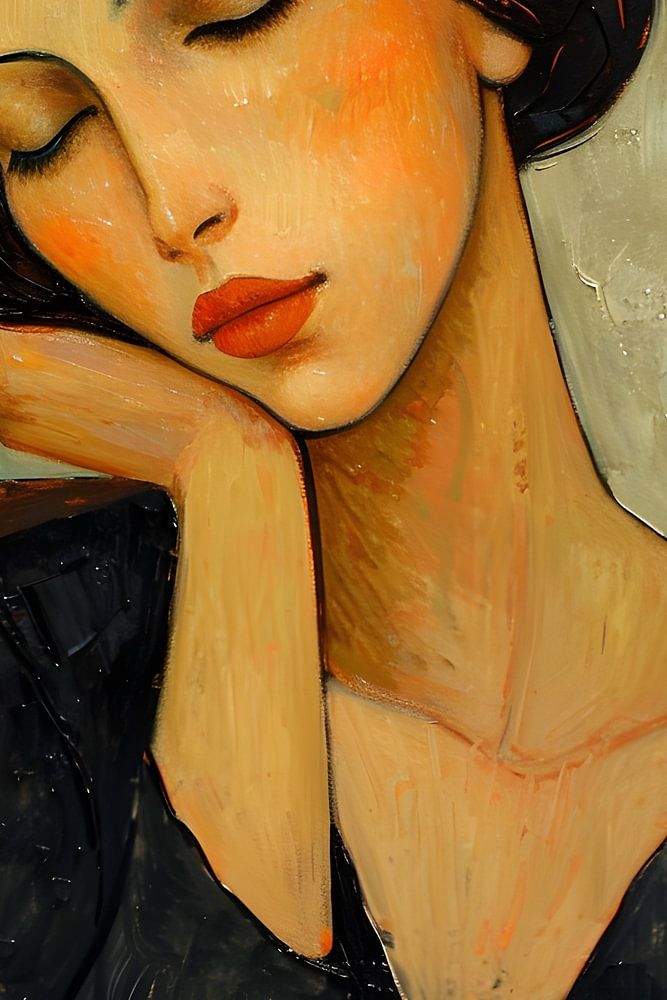 Un tableau dans le style d'Amedeo Modigliani représentant une femme pensive. La femme a des traits longs et élégants et des yeux fermés. Son visage fin et son image corporelle stylisée lui confèrent une beauté intemporelle. Les tons chauds et les lignes douces du tableau soulignent la profondeur émotionnelle de la femme et créent une atmosphère de calme et de contemplation. Le tableau invite le spectateur à se plonger dans l'univers mental de la femme et à réfléchir à la complexité des émotions humaines.