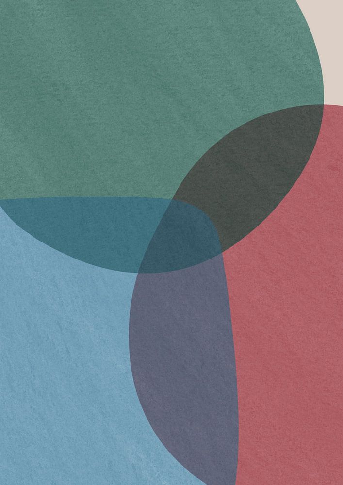Trois formes, combinées de manière ludique où les couleurs se mélangent. Rouge, bleu et vert, des couleurs primaires mais "lavées". Titre : "Blend".