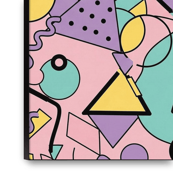 Une composition abstraite vibrante inspirée par le mouvement de design Memphis, avec des formes géométriques audacieuses dans des tons pastel et néon de rose, turquoise, jaune et violet. Cette œuvre d'art rayonne d'amusement, d'énergie et de nostalgie rétro - parfaite pour ajouter de la personnalité aux espaces modernes ou créatifs.