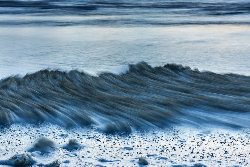 Juste après le coucher du soleil, la photo a été prise à Texel, sur la mer du Nord, l'eau coulant doucement d'un côté à l'autre. L'eau devient bleue, le ciel est nuageux, mais aussi orange.