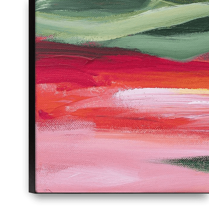 Peinture acrylique abstraite et colorée ; une mer avec des vagues roses, orange, rouges et vertes.