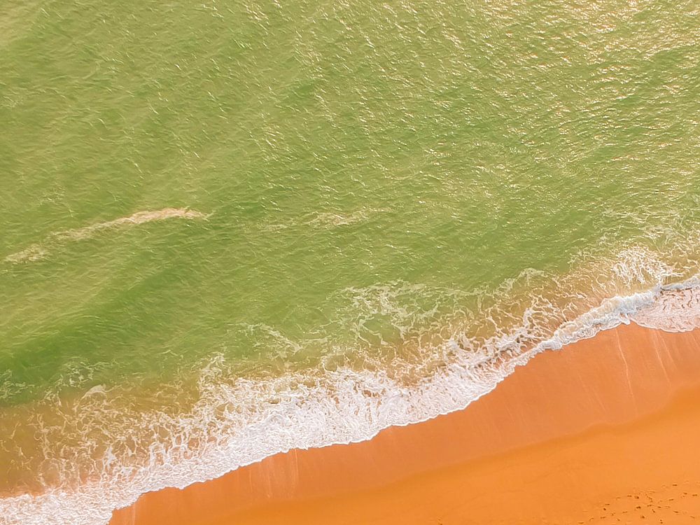 Mer vitamine. Les vagues turquoises roulent sur la plage orange au Portugal. Vu d'en haut, la photo est réalisée avec un drone.