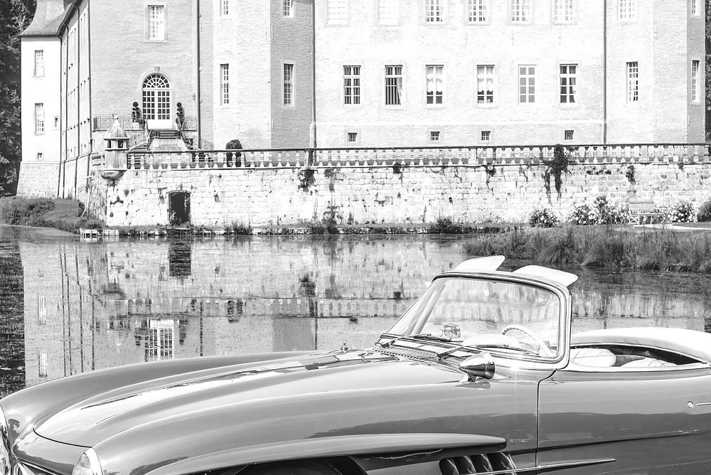 Voiture de sport classique Mercedes Benz 300SL Roadster convertible garée devant le château de Dyck en Allemagne. Le roadster SL (super-leicht) Grand Tourer a été produit de 1957 à 1963. Photo en noir et blanc.