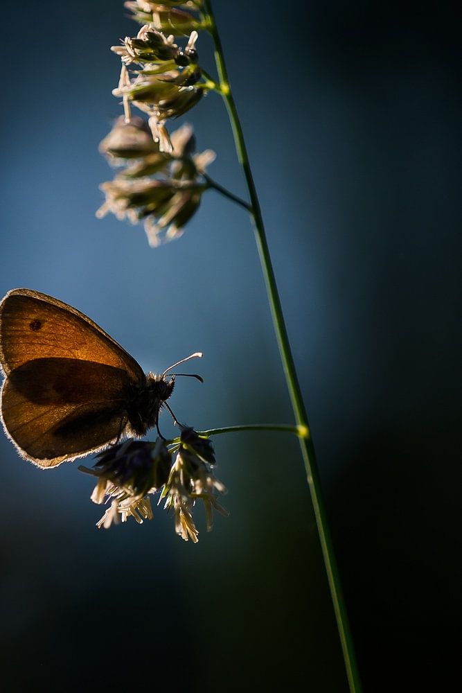 Cet oiseau de foin est assis dans la dernière lumière de ce jour. Une lumière subtile brille encore à travers les ailes. En raison d'une sous-exposition, le papillon est bien exposé et l'environnement devient très sombre. Le papillon et le brin d'herbe sont ainsi très bien mis en valeur.