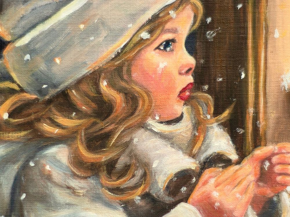 Une belle peinture d'une jeune fille regardant avec émerveillement les jouets d'une vitrine au milieu des flocons de neige qui tombent.