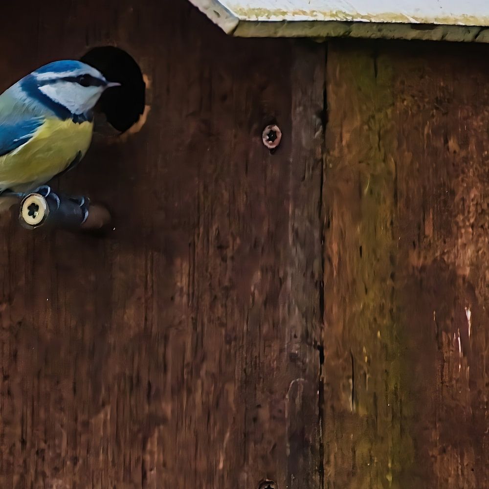 La photo montre un nichoir accroché à une clôture. La mésange bleue s'assoit sur le bâton et regarde à l'intérieur.