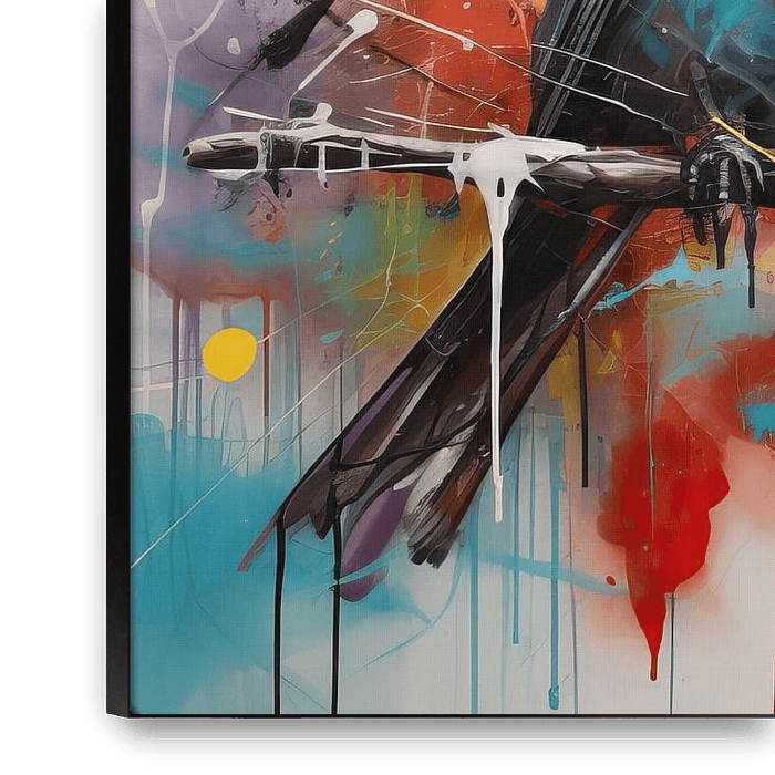 Mésanges vivantes - Vous voyez ici une fusion fascinante entre street art et représentation réaliste : deux oiseaux vivants, peut-être des mésanges, qui vous regardent fixement de leurs yeux perçants. L'arrière-plan est une explosion de couleurs, une palette éclatante qui semble couler de la toile, les accents jaunes et roses vifs ajoutant une énergie dynamique, presque néon.