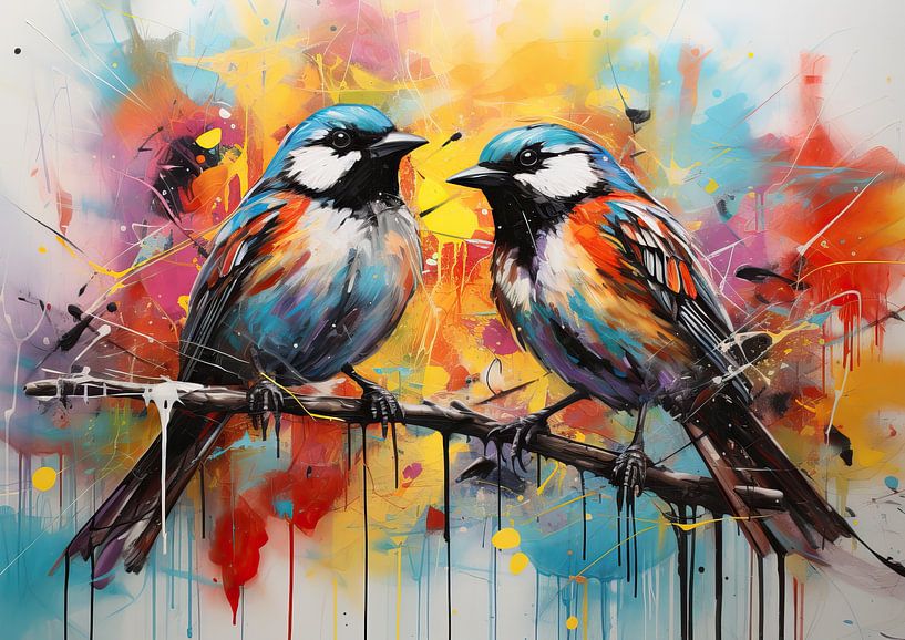 Mésanges vivantes - Vous voyez ici une fusion fascinante entre street art et représentation réaliste : deux oiseaux vivants, peut-être des mésanges, qui vous regardent fixement de leurs yeux perçants. L'arrière-plan est une explosion de couleurs, une palette éclatante qui semble couler de la toile, les accents jaunes et roses vifs…