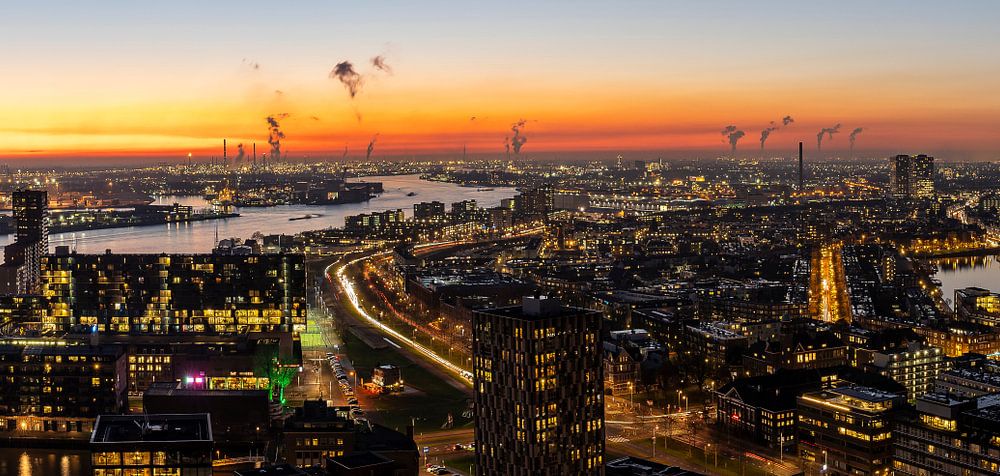 Photo du soir de Rotterdam depuis l'Euromast. Cette image montre clairement la taille de la ville. Au loin les cheminées de Pernis et encore plus loin Europoort.