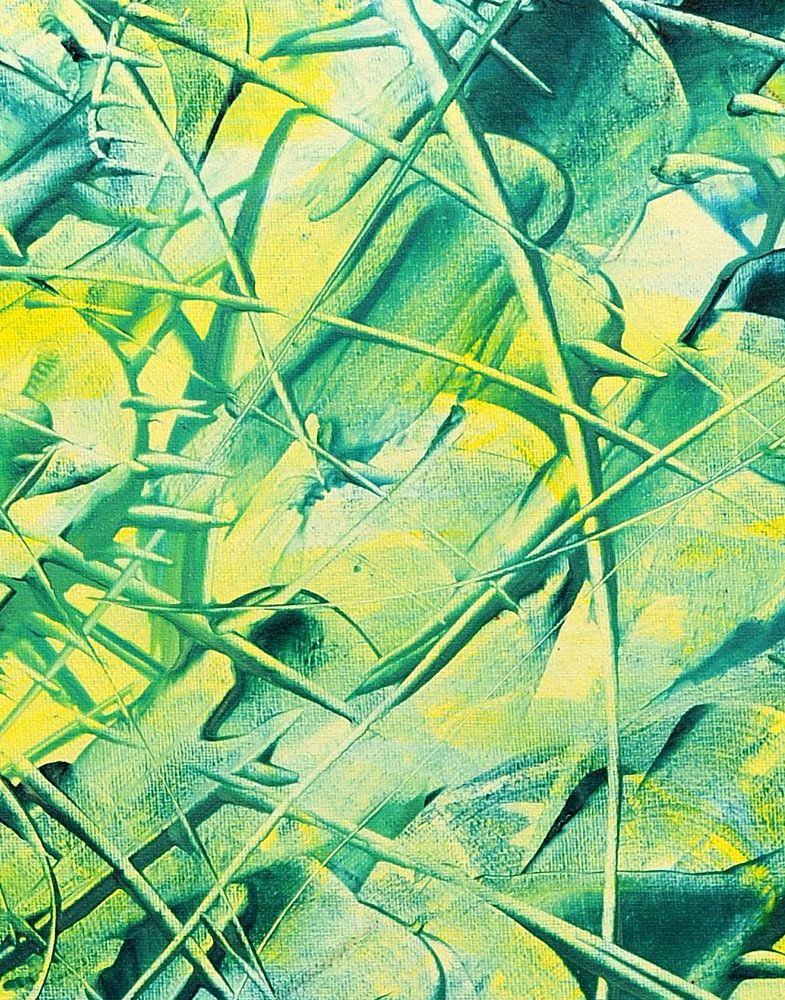 Techniquement, il s'agit d'un grattage (littéralement : grattage). Pour être précis : grattage avec un couteau à palette dans la peinture encore humide. Au cours de ce processus, la couche supérieure est partiellement enlevée, révélant la couche sous-jacente. Cela permet de créer des formes organiques (ou biomorphiques), mais aussi des lignes nettes et tendues. De fines transitions et nuances sont créées dans les couleurs.