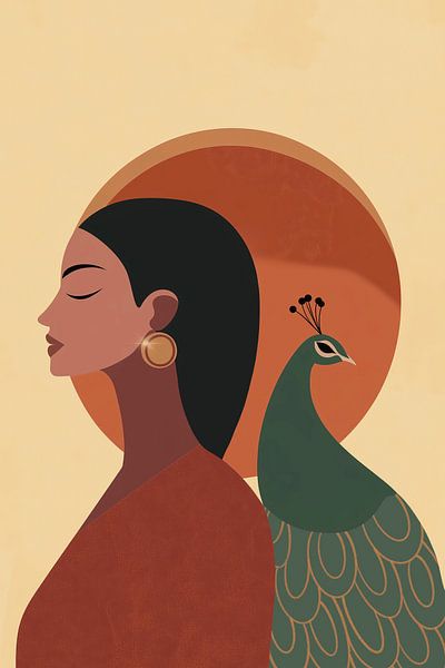 Une illustration minimaliste représentant une femme avec un paon derrière elle. L'œuvre est composée de tons terracotta chauds et d'accents doux en arrière-plan. Le paon est dessiné dans un vert sauge doux. Des formes géométriques épurées, des couleurs modernes et un aspect naturel et terreux confèrent à l'ensemble une atmosphère…