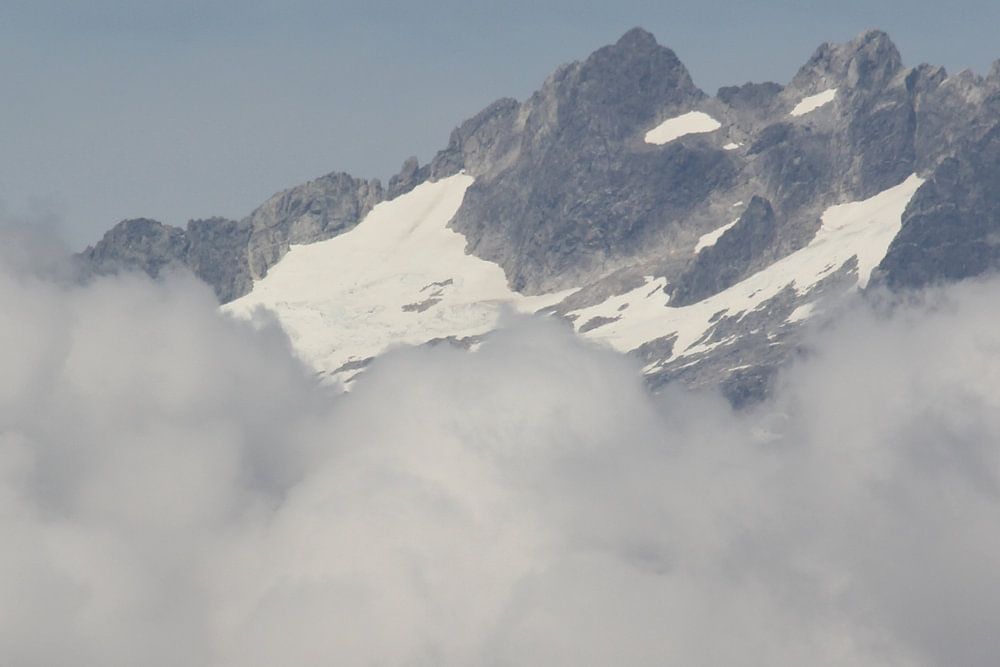 Un fjord profond, entre des falaises de plusieurs centaines de mètres de haut. En arrière-plan du fjord, on aperçoit les Alpes néo-zélandaises et leurs glaciers.