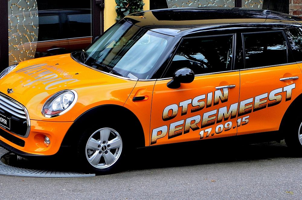 Cette Mini Cooper orange, portant le texte "Otsin peremeest" (quelque chose comme : hôte recherché), a été photographiée dans la ville médiévale de Tallinn, la capitale de l'Estonie, le 20 juillet 2015.