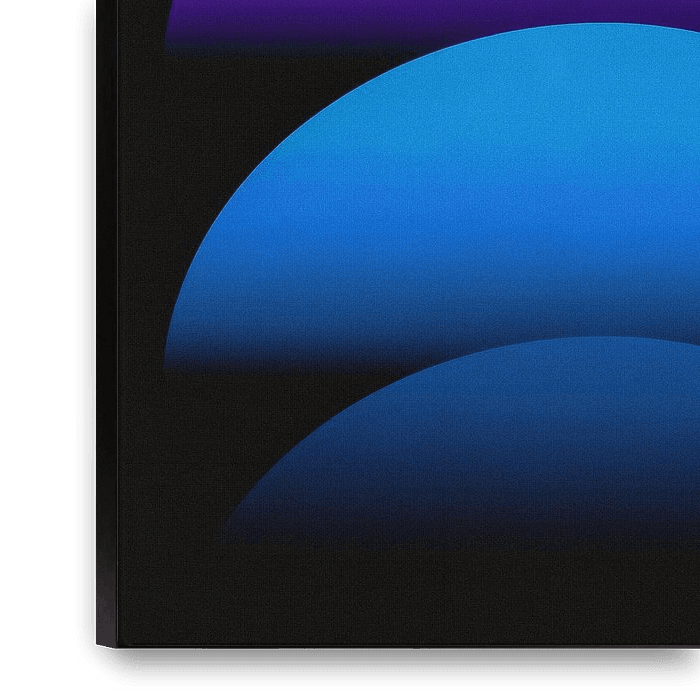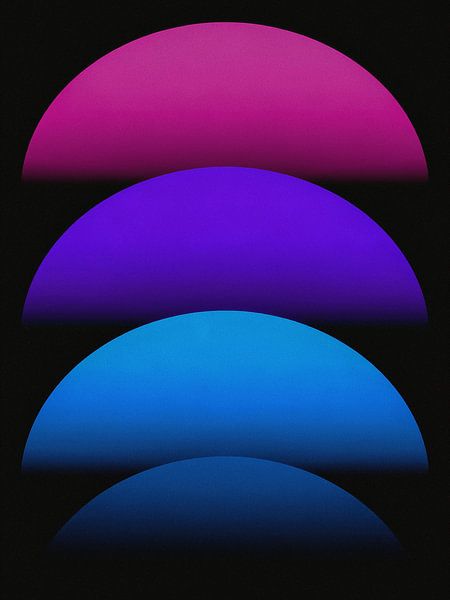 Illuminez vos murs avec l'énergie électrique de ce chef-d'œuvre abstrait moderne. Sur un fond noir profond, quatre hémisphères vibrants s'empilent dans un étonnant dégradé de néons, passant d'un riche rose magenta et d'un violet royal à un bleu électrique brillant.
