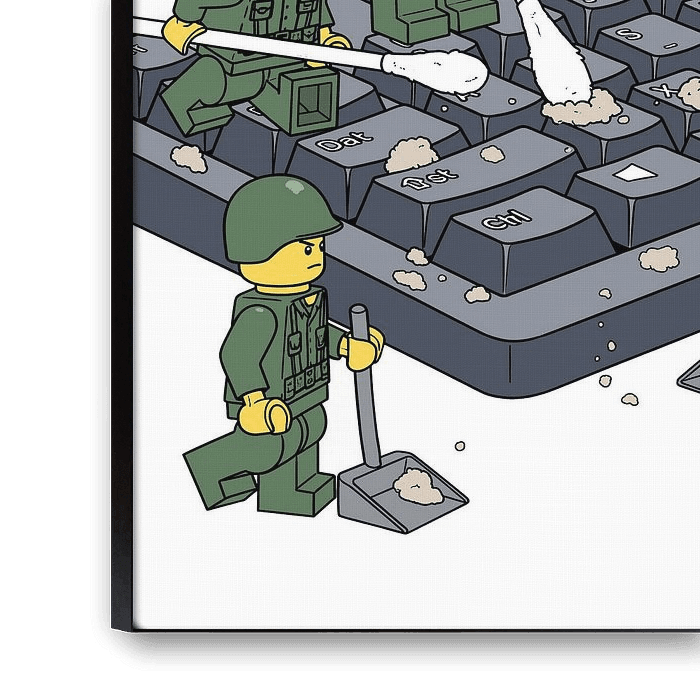 Cette illustration montre un groupe de petits soldats travaillant ensemble, utilisant des cotons-tiges et des poubelles pour nettoyer la poussière et la saleté d'un clavier d'ordinateur.