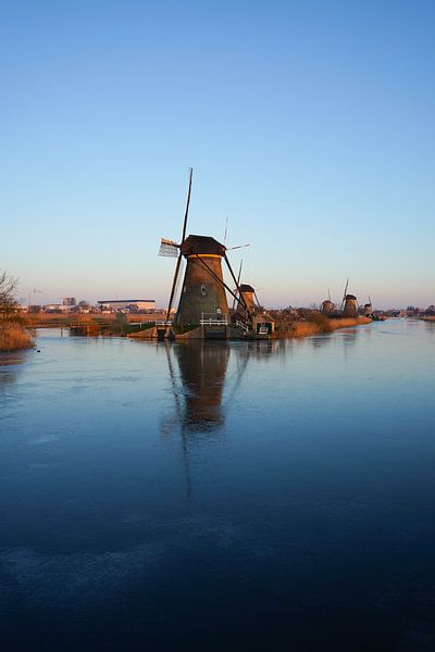 portret foto, van een kinderdijk molen, reflecteert op het ijs water
