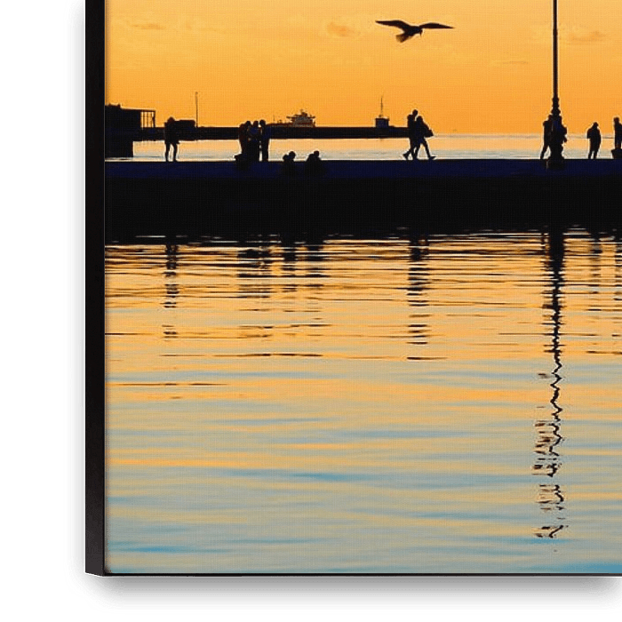 L'image montre le Molo Audace à Trieste au coucher du soleil. Le ciel est baigné dans des tons chauds d'orange profond, d'or et de rose, tandis que le soleil disparaît lentement derrière l'horizon. La jetée s'étend tout droit dans la mer, flanquée d'une eau calme et doucement scintillante qui reflète la lumière du coucher de soleil. Sur…