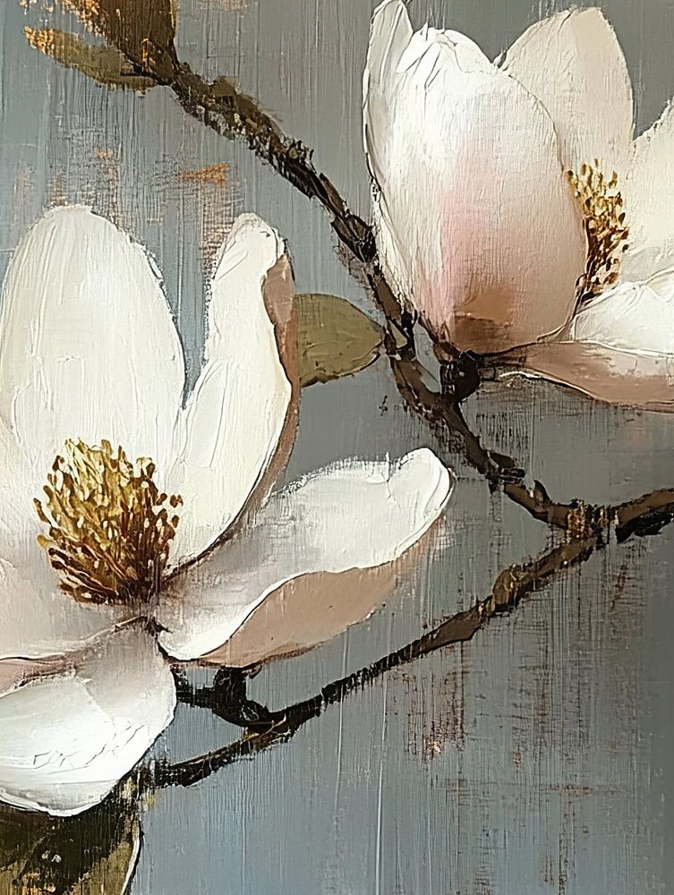 Moments de grâce de la nature - Ce tableau de fleurs représente deux magnolias fanés sur un fond bleu-gris avec des accents dorés.