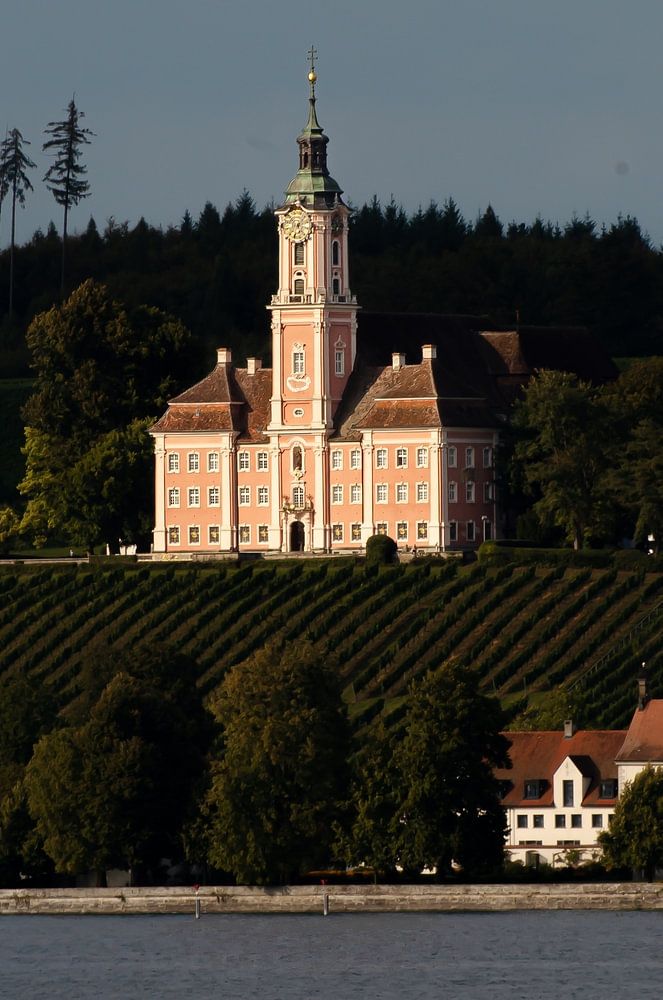 Le beau monastère de Bernau s'illumine au coucher du soleil sur le lac de Constance.