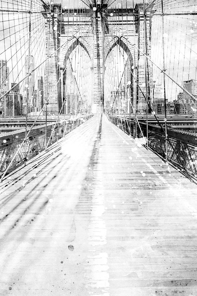Le pont de Brooklyn à New York est l'un des plus anciens ponts suspendus des États-Unis. Il enjambe l'East River et relie les districts de Manhattan et de Brooklyn. Photographie architecturale décorative. Les aquarelles monochromes et les nuances graphiques trouvent une combinaison unique et soulignent la dynamique urbaine.