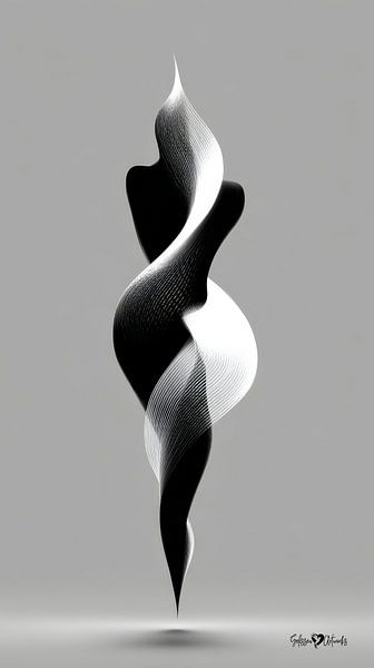 In deze zorgvuldig samengestelde collectie draait alles om elegantie, eenvoud en rust. Elk kunstwerk toont een vloeiend spel van organische vormen die lijken te zweven of te dansen op een onzichtbare luchtstroom. De werken doen denken aan textiele sculpturen, wervelende linten of rookpluimen – alles in subtiel gedetailleerde zwart-witte tinten die tijdloosheid en verfijning uitstralen.
