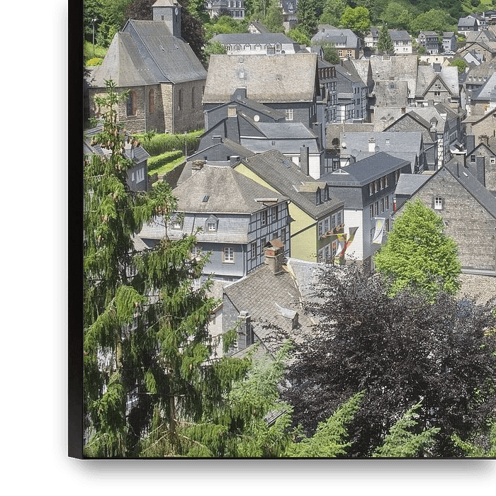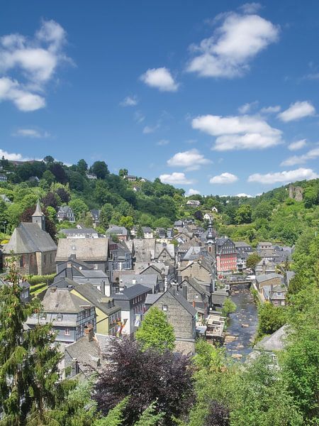 Vue sur le village médiéval pittoresque de Monschau avec la rivière Rur dans l'Eifel près du parc national de l'Eifel,Rhénanie-du-Nord-Westphalie,Allemagne