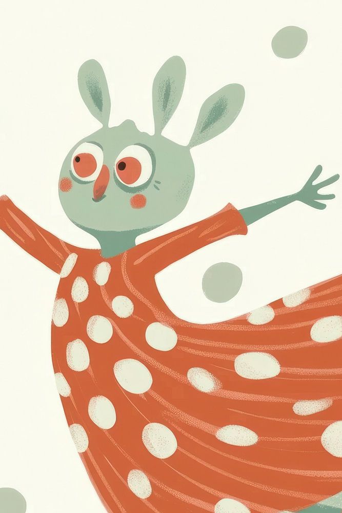 Imaginez une œuvre d'art adorable qui s'intègre parfaitement dans une chambre d'enfant, mettant en scène un monstre sympathique et attachant. Ce monstre porte une robe à pois rouges et de grands yeux pétillants qui semblent pleins de curiosité et de gentillesse. Le monstre vole dans les airs et semble prêt à faire un câlin.