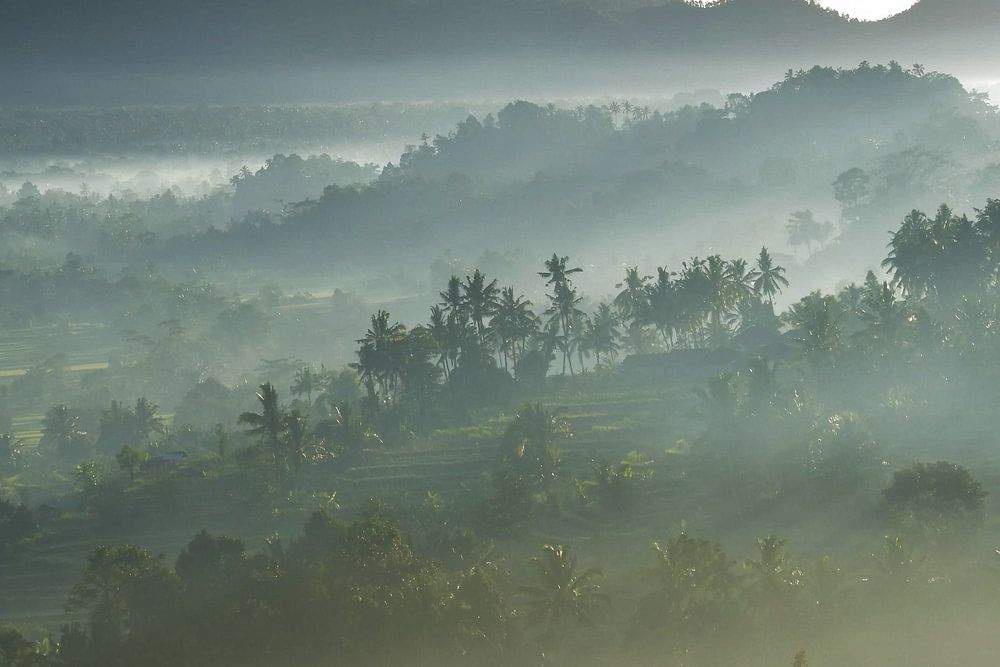 Photo de la forêt tropicale devant le mont Agung. De belles lignes dans le paysage et différentes couleurs de vert enveloppées de brume. Gris, blanc, vert clair, vert mousse, bleu-vert, jaune-vert. Photo prise à Sidemen Bali.