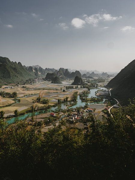 Les montagnes à gauche marquent la frontière chinoise et nous surplombons une vallée vietnamienne, avec ses rizières, une rivière qui serpente à travers le paysage et des montagnes qui surgissent du sol comme par enchantement.