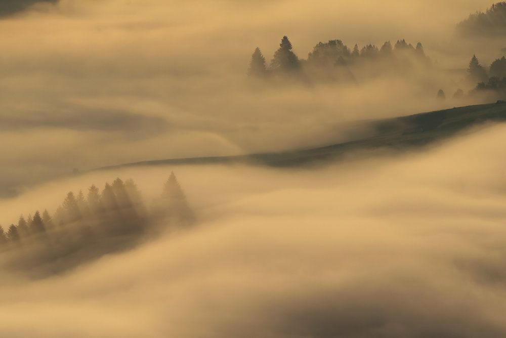 Arbres dans le brouillard dans les montagnes de Pieniny au lever du soleil, Pologne