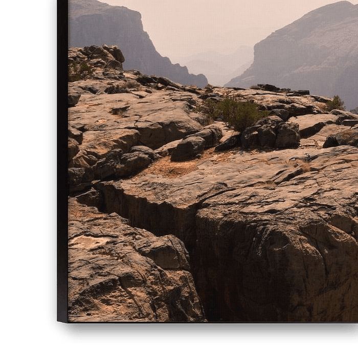 Cette photo montre un vaste paysage montagneux, probablement à Oman. Au premier plan, on voit un rocher escarpé entre lequel poussent de petits buissons. Les rochers sont de couleur marron clair et leur surface est altérée. Derrière, de grandes montagnes sombres s'étendent, avec des falaises abruptes et des vallées profondes. Au centre de l'image, on peut voir une route sinueuse qui serpente dans la vallée et qui finit par disparaître dans les montagnes. Quelques petits bâtiments sont également visibles, probablement un village ou un établissement. Le ciel est légèrement nuageux, avec une lueur rose et brumeuse, qui pourrait indiquer la présence de poussière ou de chaleur dans l'air. L'ensemble de la scène est sec, rocailleux et désolé, typique d'une zone montagneuse désertique. La combinaison de la hauteur, de la profondeur et de la lumière crée une vue impressionnante du terrain accidenté.