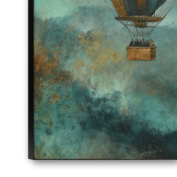 Une peinture rêveuse de montgolfières flottant doucement au-dessus de mystérieuses montagnes turquoise. Une peinture intemporelle qui évoque la tranquillité, l'émerveillement et une touche de nostalgie. Cette œuvre s'intègre parfaitement dans les intérieurs scandinaves, romantiques et vintage et constitue un ajout charmant pour le salon, la chambre à coucher, la chambre de bébé ou la chambre d'enfant.