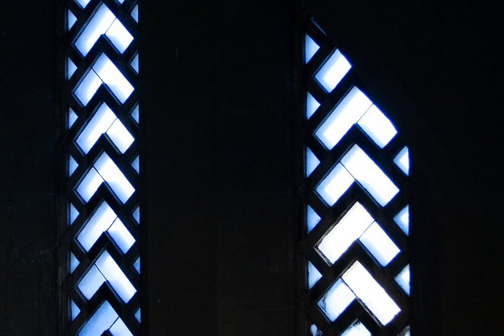 Détails abstraits d'un monument en bleu et gris, avec des courbes et des motifs. Couleurs froides, avec des répétitions.