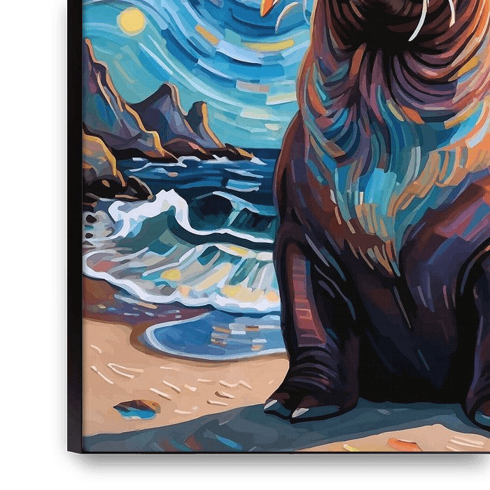 Un morse majestueux se repose au bord de la mer, sa grande forme baignant dans la douce lueur d'un ciel inspiré de *Starry Night*. Les bleus tourbillonnants et les jaunes éclatants du ciel dansent au-dessus, reflétant les étoiles scintillantes et l'énergie cosmique. Les douces vagues de la mer reflètent les coups de pinceau dynamiques…