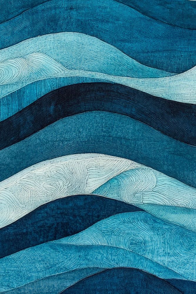 De douces vagues dans différentes nuances de bleu invitent à se remémorer l'océan et créent une atmosphère apaisante. L'agencement harmonieux des couleurs crée une ambiance détendue, parfaitement adaptée à la chambre à coucher ou à un salon moderne, où le calme et la sérénité sont au premier plan.