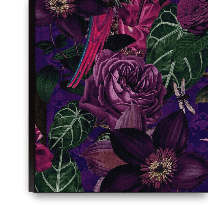 Motif floral exotique atmosphérique avec des oiseaux dans des tons violets et bordeaux foncés.