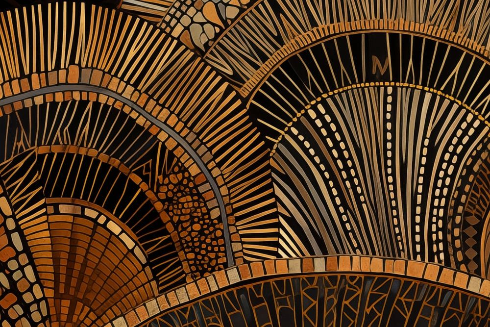 Cette œuvre présente un intriguant motif en arc de cercle dans différentes nuances d'or et de brun. Les lignes et les textures qui se chevauchent créent un sentiment de profondeur et de complexité, inspiré à la fois par les formes géométriques et les éléments naturels. La composition détaillée dégage une atmosphère chaleureuse et sophistiquée.